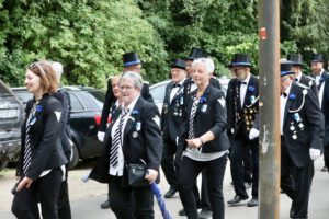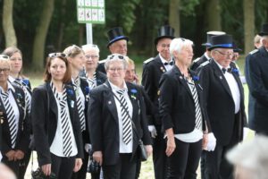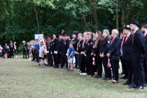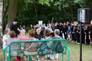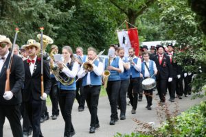Am Samstag, dem 05. Juli, startete der Tag mit dem traditionellen Ausmarsch der Kompanien um 12:00 Uhr. Begleitet von der Wiedensahler Dorfkapelle zogen die Schützen zunächst zum Haus der Vorjahreskönigin Elena Jäkel und ihres Prinzgemahls Frank, um die beiden abzuholen. Nach einem kurzen Aufenthalt am Ehrenmal, bei dem ein Kranz