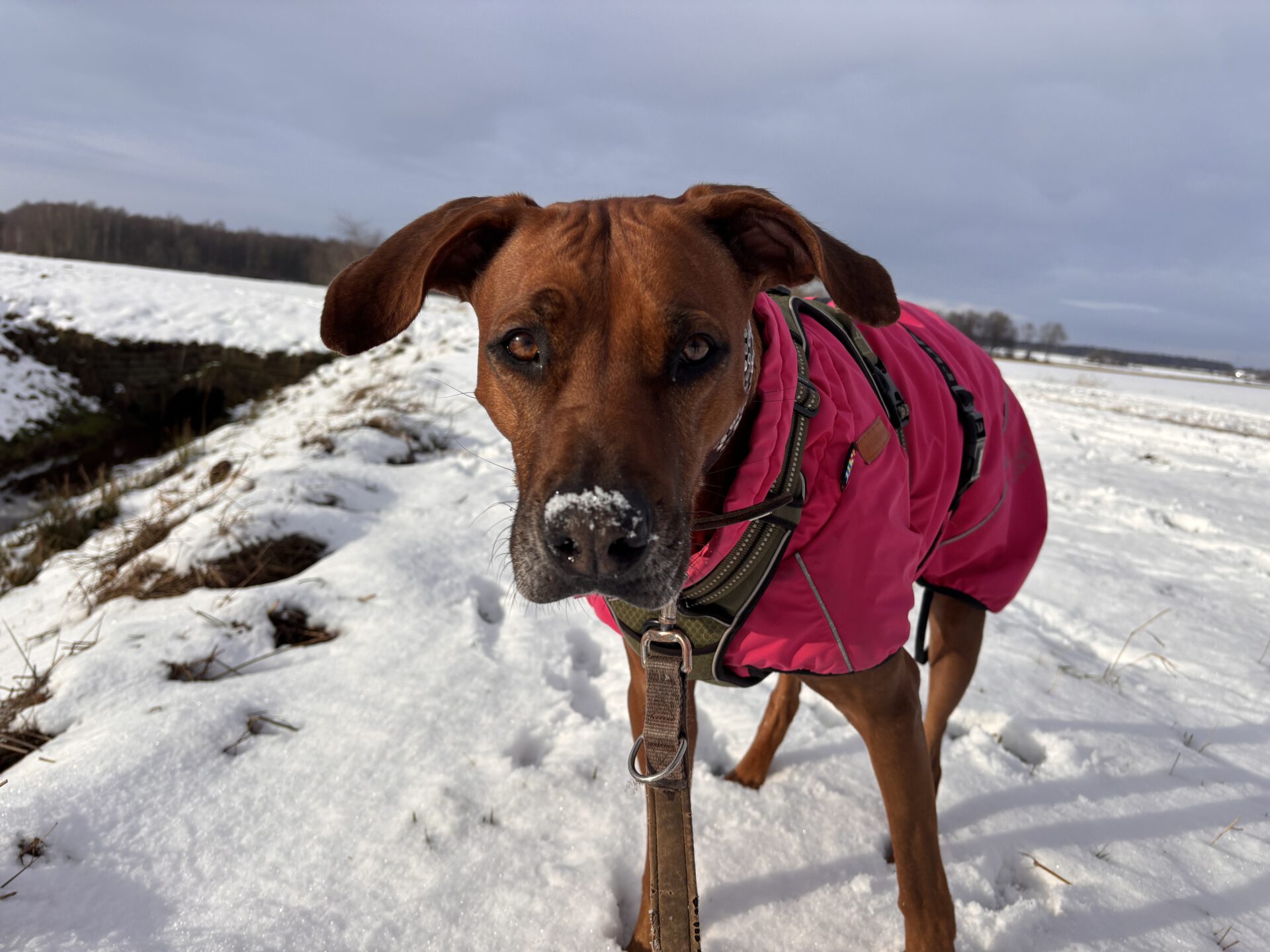 Ridgeback Akiki trägt bei diesem Wetter gerne ihren Mantel. Foto: Jessica Höffner