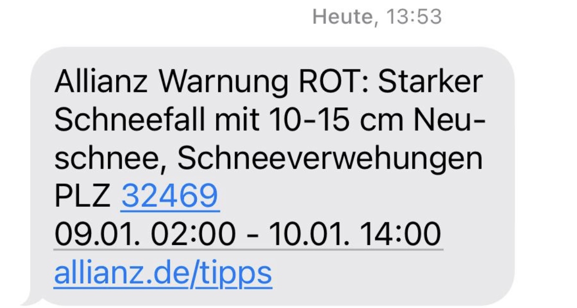 Kunden der Allianz werden per SMS gewarnt. Einer unserer Leser schickte uns diesen Screenshot. Die Allianz hat die Warnung „Rot“ ausgesprochen und warnt im Raum Petershagen vor starkem Schneefall mit 10 bis 15 Zentimetern Neuschnee und Schneeverwehungen. Laut Allianz-Warnung soll der Schneefall heute Nacht ab 2 Uhr einsetzen; die Warnung gilt dann bis Samstag, 10. Januar, 14 Uhr.