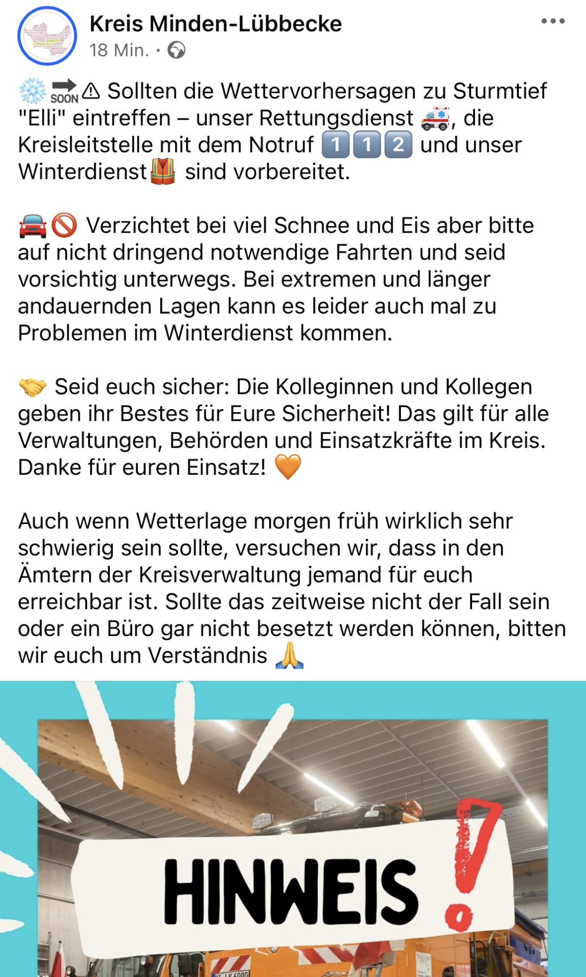 Der Kreis Minden-Lübbecke hat auf seiner Facebook-Seite einen Post veröffentlicht, der unter anderem darauf hinweist, dass der Rettungsdienst, die Kreisleitstelle mit dem Notruf und der Winterdienst gut vorbereitet sind, wenn Sturmtief „Elli“ – wie angekündigt – auch für eine extreme Wetterlage im Kreisgebiet sorgen sollte. „Verzichtet bei viel Schnee und Eis aber bitte auf nicht dringend notwendige Fahrten und seid vorsichtig unterwegs“, schreibt der Kreis in dem Post weiter. „Seid euch sicher: Die Kolleginnen und Kollegen geben ihr Bestes für eure Sicherheit. Das gilt für alle Verwaltungen, Behörden und Einsatzkräfte im Kreis. Danke für euren Einsatz“, heißt es weiter im Facebook-Post.