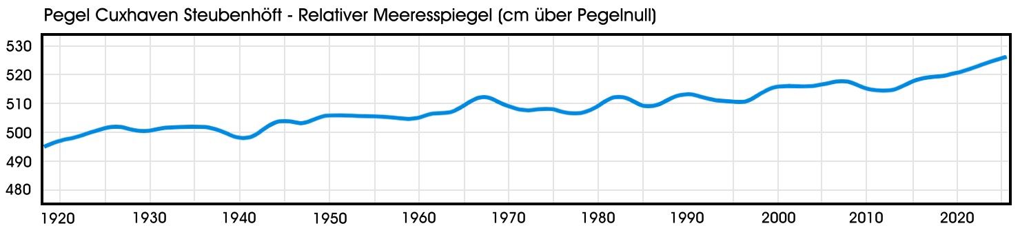Geglättete Kurve der Monatsmittelwerte am Pegel Cuxhaven Steubenhöft von 1/1918 bis 11/2025. Quelle (mit weiteren Erläuterungen): www.bsh.de/DE/THEMEN/Klima/Relativer_Meeresspiegel/relativer-meeresspiegel_node.html