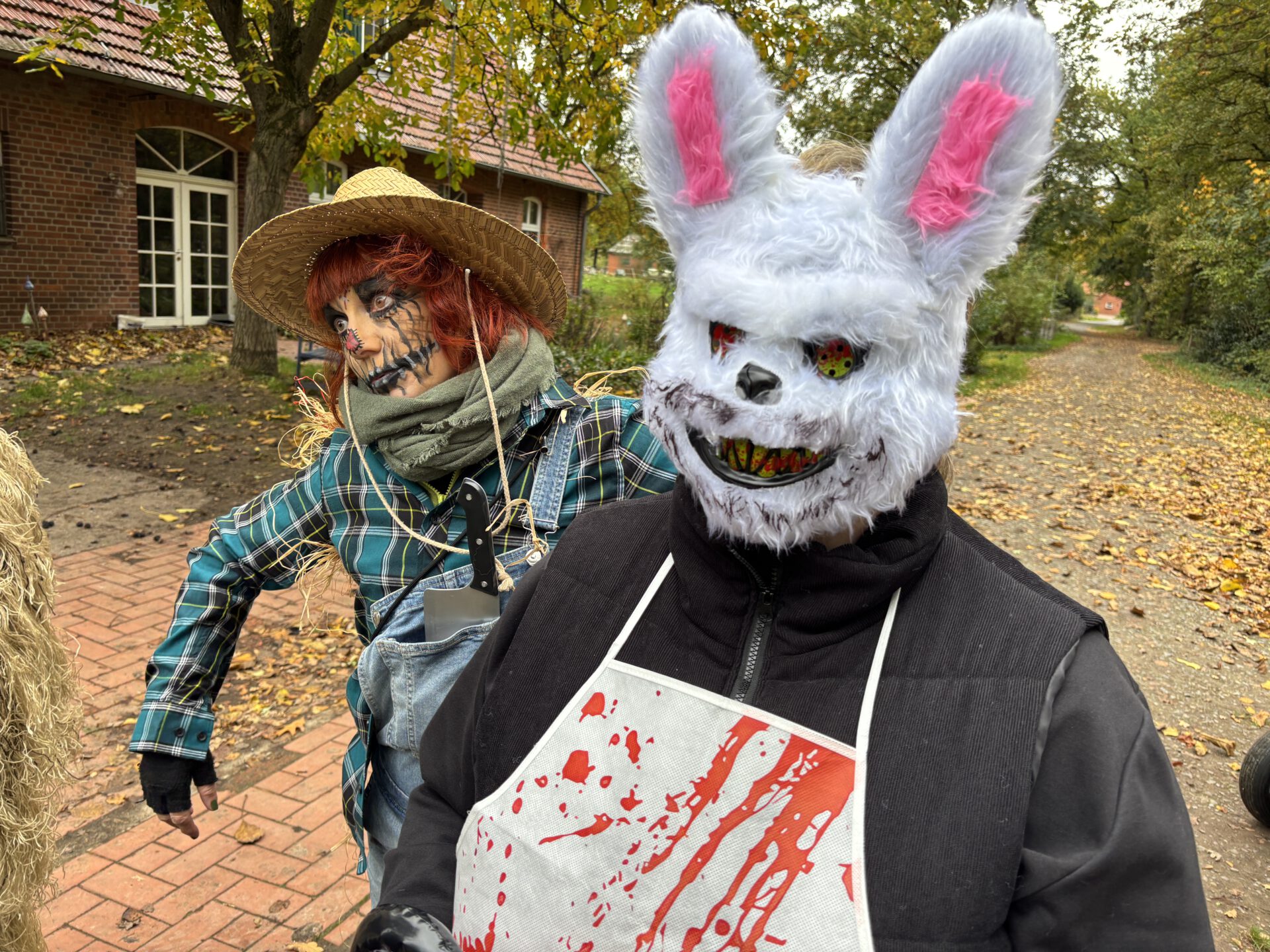 Die Dorfbewohner wissen das längst. Sie sind vorbereitet, haben meist schon einen „Schein“ in der Hosentasche parat, wenn es an der Tür klingelt. Hier und da gibt es noch einen Schnaps, eine Flasche Bier, etwas Süßes, während das gespendete Geld im kleinen Hut im Kürbis-Look verschwindet. „ … Jeder Cent ist für nen guten Zweck, drum gebt es frohen Herzens weg … “ lautet eine Passage des Spruches, den die Ladies an diesem Tag wieder und wieder aufsagen werden. Ein paar Häuser später ist es nicht nur der Spruch, den die Frauen aufsagen. Gemeinsam stimmen sie ein, singen ein Ständchen für Jörg, der an diesem Tag seinen 50. Geburtstag hat. Er freut sich über den Besuch der „schönen Frauen“, gibt Schnaps und Geld und lädt sie dann noch zur Feier am Abend ein. „Mal sehen, ob wir da noch hingehen“, sagt Kathrin, die heute als blutverschmierter Sträfling unterwegs ist. Und sie ergänzt: „Noch haben wir ja einige Häuser vor uns. Meistens sind wir erst gegen 20 oder 21 Uhr beim letzten Haus angekommen“, sagt sie. Seit 9 Uhr sind sie unterwegs. Ein langer Tag – und einer, der zeigt, wie gut und wichtig eine funktionierende Dorfgemeinschaft ist. Die Jüngsten der Gruppe sind gerade 18 oder ein wenig älter und zum ersten Mal dabei. Die „Älteren“ kennen die Route durchs Dorf schon aus dem Effeff. Und sie wissen auch, an welchen Häusern sie nicht klingeln müssen. „Die sind im Urlaub“, ruft eine der Frauen, als ein Teil der Gruppe gerade Richtung Haustür abbiegt. Ein paar Häuser weiter klingeln sie nie. „Die Leute, die hier wohnen, möchten das nicht“, sagt eine der schaurig-schönen Frauen.