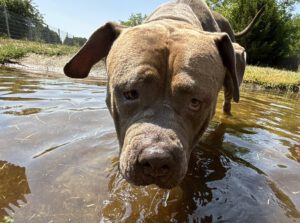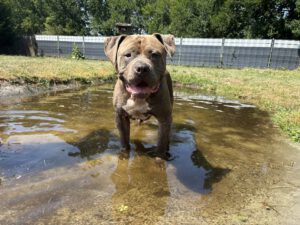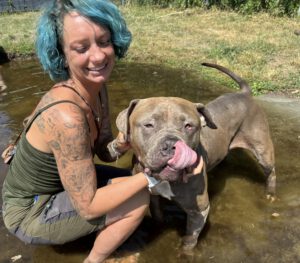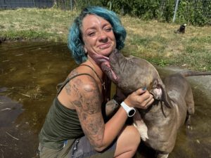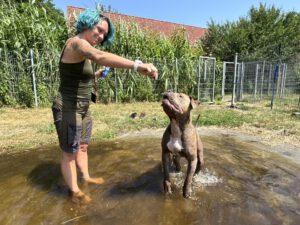 Megan Foster (32) hat die Schuhe beiseite gestellt. Die Leiterin des Tierheimes Drakenburg genießt diese Momente mit Kimba in der Hunde-Badestelle. Kimba gehört zu ihren „Sorgenkindern“. Die American Bully XL-Hündin ist nicht nur eine Qualzucht, sondern auch nach einer fast tödlichen Attacke im Familienrudel im Tierheim gelandet. 45 Kilo bringt die etwa vier Jahre alte Hündin auf die Waage. Sie schleppt sich mit Arthrosen durchs Leben, einer zu langen Wirbelsäule und Rollliedern, die mittlerweile operiert wurden. Kimbas Charakter? „Sehr menschenfreundlich, liebevoll zu Kindern, eine Wasserratte und totale Schmusebacke“, sagt Megan Foster, während ihr Kimba kräftig über das Gesicht leckt. Die Suche nach einem neuen Zuhause gestaltet sich dennoch schwierig – vielleicht auch, weil schon jetzt klar scheint, dass Kimba aufgrund ihrer Krankheitsgeschichte vermutlich früher über die Regenbogenbrücke gehen muss, als ihre Artgenossen. „Dazu kommt, dass Kimba regelmäßig tierärztliche Betreuung benötigt. Ein Kostenfaktor für die neuen Besitzer“, sagt Tierheimleiterin Megan Foster.